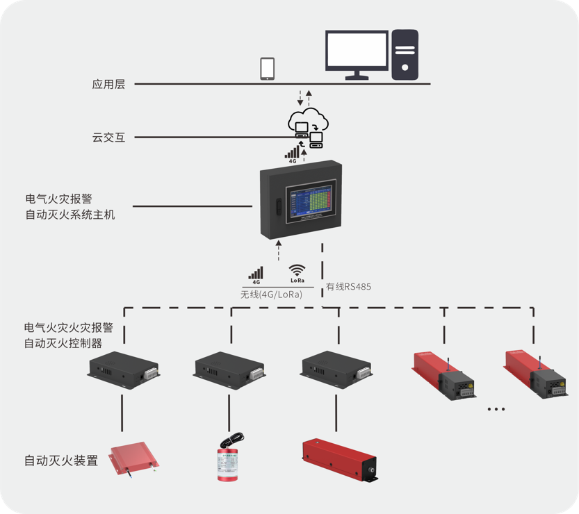 电气火灾报警自动灭火系统主要由报警灭火系统主机、报警灭火控制器和自动灭火装置三大部分组成,是以异常预警、火灾报警、自动灭火、系统状态显示、消防记录为性能要求的—个完整电气火灾监测灭火系统。对被覆盖的网络区域环境进行电气火灾防护,实时在线监测、实时感知和采集网络覆盖区域中温度、湿度和烟感状态。